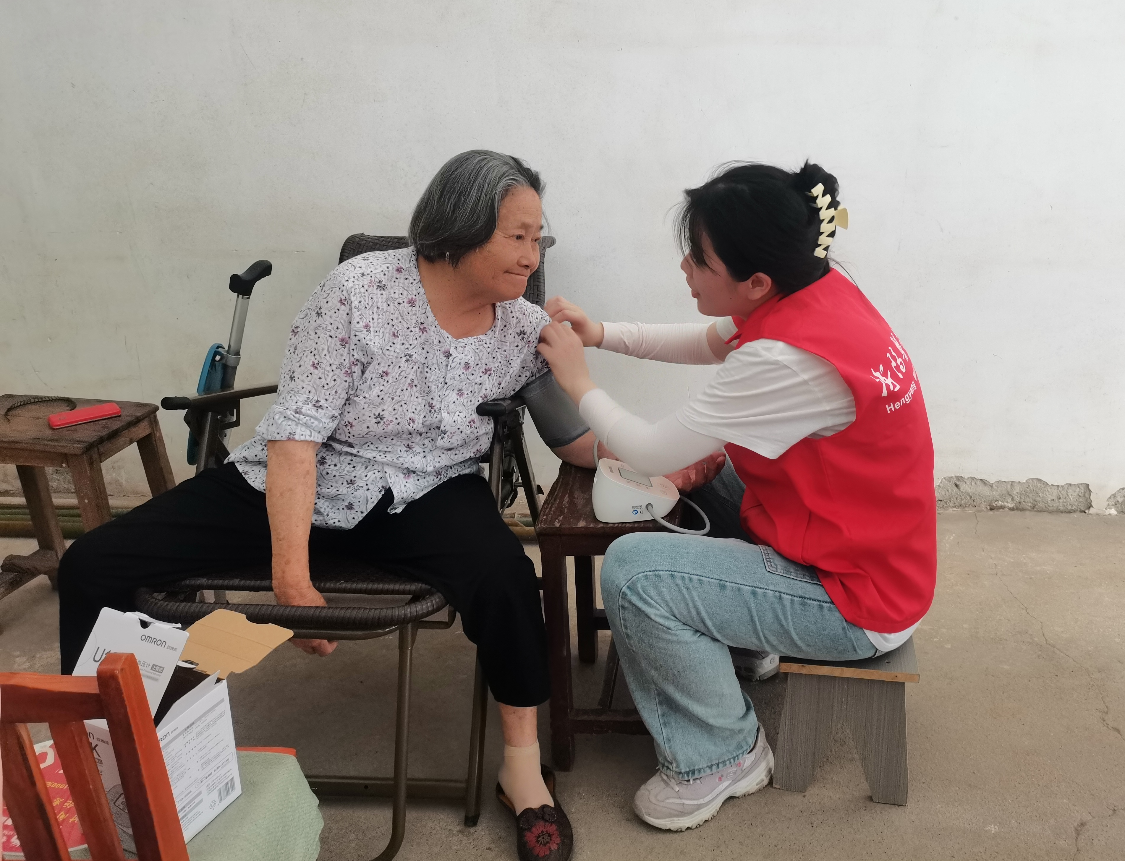 书记还带领我们走访了一位八旬低保老人,服务团询问了她的健康和家庭情况。老人告诉我们她患有多种基础疾病,考虑到她有脑卒中的病史,我们给她进行了血压的测量并及时发现了她的血压情况不良。