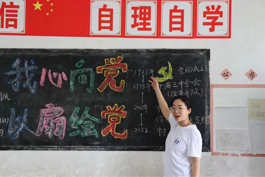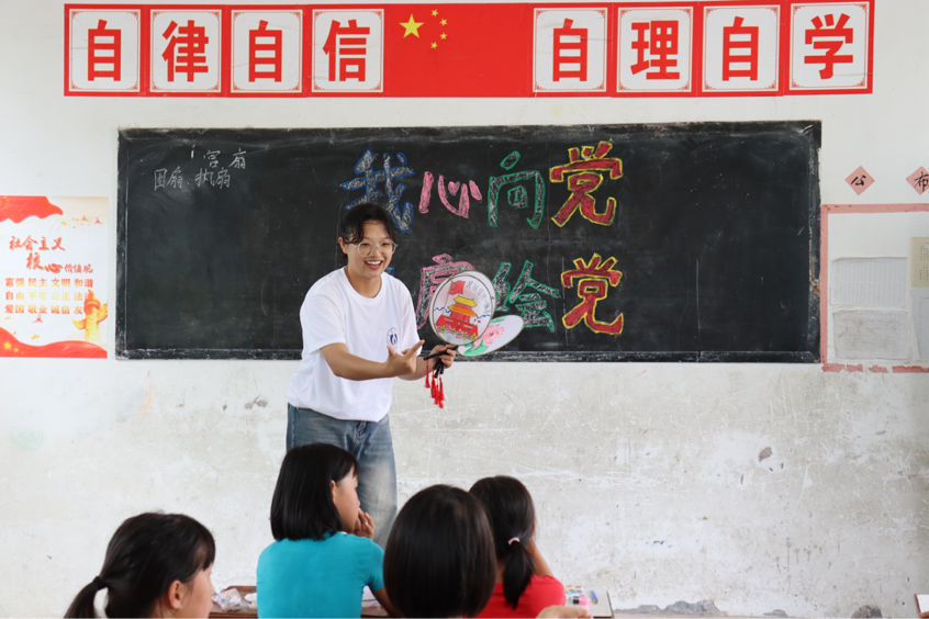 7月14日下午,太阳成集团tyc122ccvip太阳成集团tyc122ccvip2023年湖南省“芙蓉学子•乡村振兴”公益计划项目之“仲夏芙蓉医路行,医路向前”志愿服务团队成员走进邵阳市绥宁县东山侗族乡牛背岭村,组织侗族儿童开展“我心向党•以扇绘党”团扇绘画实践主题活动。