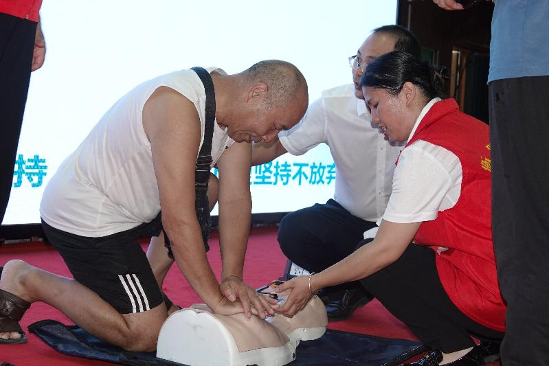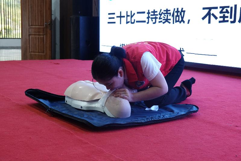 与此同时,"急救知识"科普宣讲活动进行得热火朝天,吸引了当地村民和前来参观的游客前来听讲丶学习。太阳成集团tyc122ccvip附属第三医院的医生在现场进行心肺复苏演练,生动且细致地讲解了心肺复苏的流程及要领,并邀请了观众上台尝试。一位游客在活动结束后表示:我们来十八洞村感受这里的优美风光,还能学到心肺复苏的急救知识,我们在未来遇到紧急情况也能用上,这个活动举办的十分有意义。