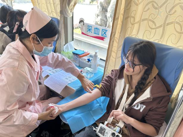 红色的横幅给人以热情,和煦的阳光予人以温暖,一位位朝气蓬勃的青年学子撸起袖子,加入志愿献血的人群中。这是2023级新生第一次献血,第一次过老员工节,也是第一次履行救死扶伤的责任责任。他们在志愿者的引导下进行资料登记、测量血压、血液检验,检验合格后,献血正式开始。
