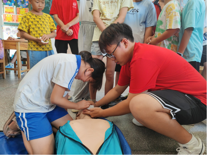 为了让孩子们更加直观地了解急救技能,志愿者们巧妙地运用了人体模型进行CPR教学。他们耐心地示范着每一个动作:从判断患者是否失去意识,到轻轻拍打患者的肩膀并大声呼唤;从迅速调整患者体位,到准确找到按压点并有力地进行胸外按压;再到打开气道、进行人工呼吸……每一个步骤都严谨规范,力求让孩子们能够真正掌握这项救命技能。