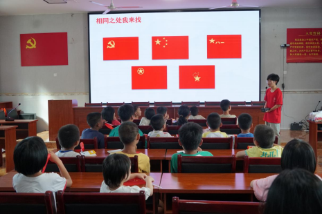在“认识祖国旗帜”环节中,实践团成员展示了旗帜高图片,讲解了每个旗帜的设计元素及其背后的深远寓意。孩子们在近距离的观察与聆听中,对党旗团旗有了更加直观且深刻的认识。实践团成员精心设计了一系列与共青团和共产党相关的知识问题,鼓励孩子们积极抢答。孩子们的热情被瞬间点燃,他们踊跃参与,竞相展示自己的学习成果,现场气氛热烈。
